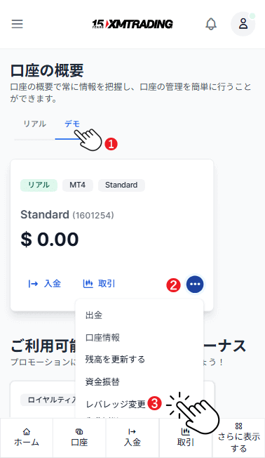 こちらでは、XMデモ口座のレバレッジ変更手順を解説します。